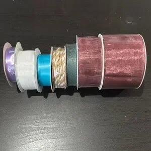 Set of seven assorted craft ribbons in various colors. Perfect for DIY projects and gift wrapping.