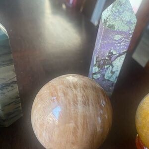 Set of 5 crystals: black obsidian, peach moonstone sphere, dendritic jasper tower, purpulite tower, and adventurine quartz sphere. All spheres comes with a holder . Perfect for any crystal lover💕