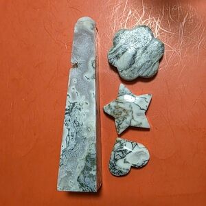 Enhance your decor with this elegant moss and tree agate set. Featuring a beautiful blend of cream and gray tones, these pieces add a touch of sophistication to any room.