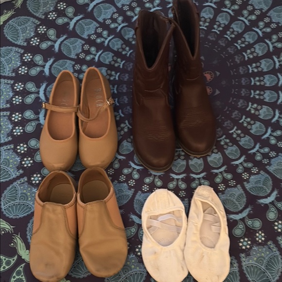 Bundle. Tan tap shoes 101/2 tan jazz shoes 11 white ballet shoes 10 chocolate brown cowgirl boots 12