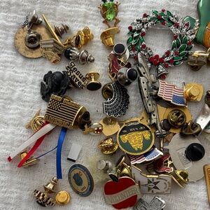A collection of assorted decorative pins featuring various designs and colors. Some of these are military pins, there are seasonal brooches tie pins just a mix of everything