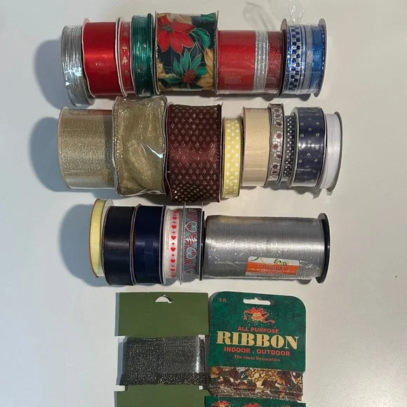A collection of assorted decorative ribbons in various colors and patterns. Perfect for crafts and gift wrapping. Various holidays and occasions. All these ribbons have been USED.