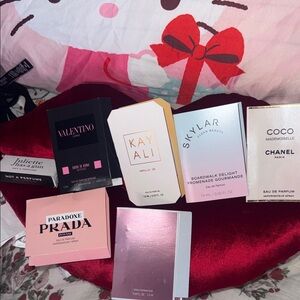 Collection of designer perfume samples. Includes brands like Dolce & Gabbana, Givenchy, Chanel, Burberry, Michael Kors, Yves Saint Laurent, and Juliette Has a Gun. Perfect for trying new scents.