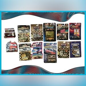 Collection of die-cast racing cars. A set up of 12 assorted collectible racing cars . Featuring a collection of NASCAR and stock car legends. Great for kids and adults with a love of face cars .