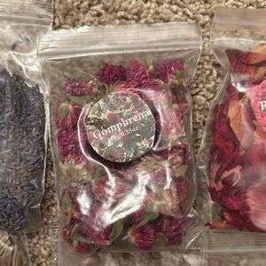 A variety of dried flowers in individual bags. Perfect for crafts and decoration. Includes multiple colors and types.