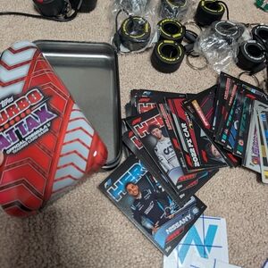 A diverse collection of racing-themed memorabilia including keychains, stickers, and more. Perfect for motorsport enthusiasts.