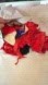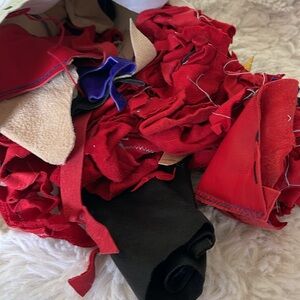 A collection of assorted fabric scraps in vibrant red and black. Perfect for crafting and DIY projects.