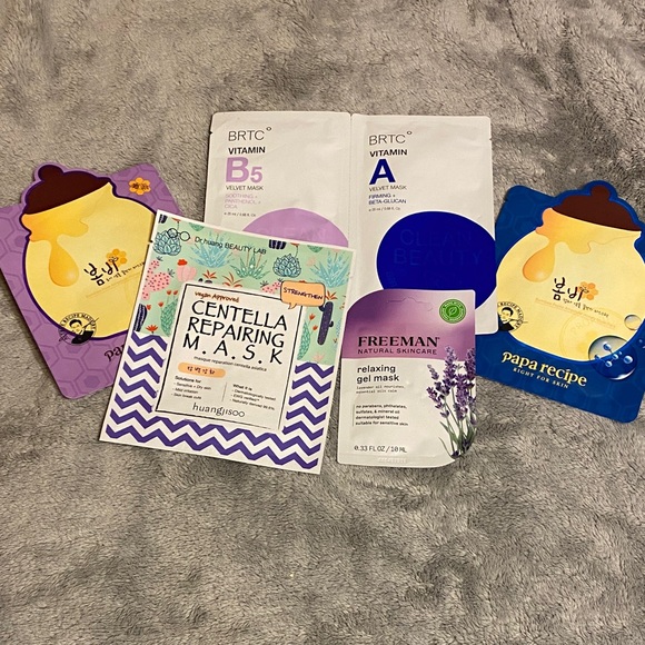 Set of assorted face masks including BRTC, Freeman, and Papa Recipe. Perfect for skincare routines. M3
