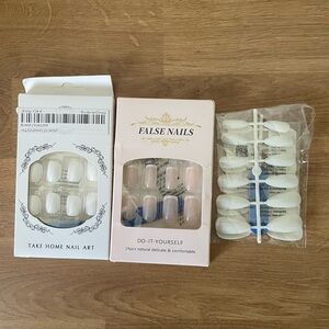 Explore a variety of stylish false nails in pink, white, and blue shades. Perfect for any occasion.