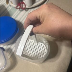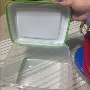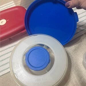 Set of assorted food storage containers in red, blue, white, and clear. Perfect for organizing your kitchen. Pickle container, freezer/refrigerator circle for keeping items cold with dip/sauce container, fresh veggie keeper, and more