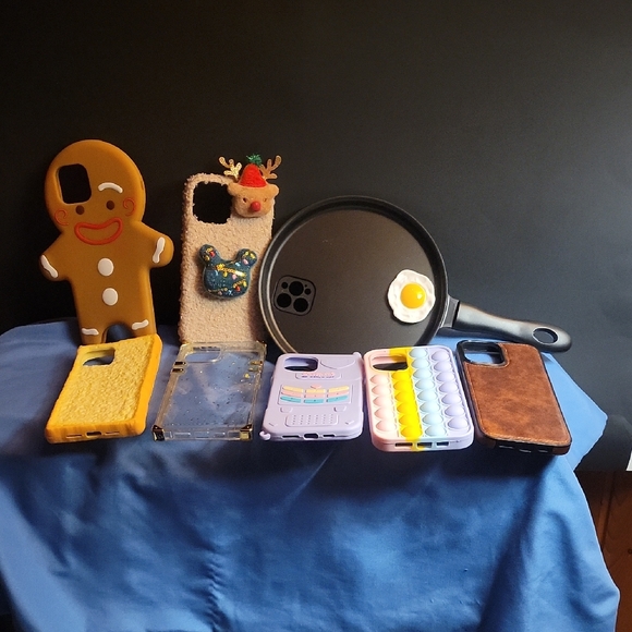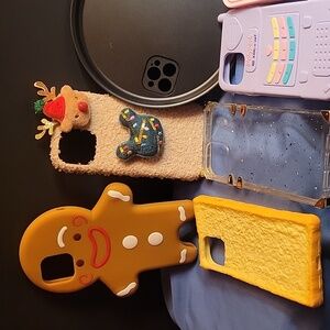 Collection of playful phone cases featuring gingerbread, reindeer, and egg designs. Includes clear, brown, and yellow options. Fits Iphone 12 pro max and 13 pro max. total 8. good condition