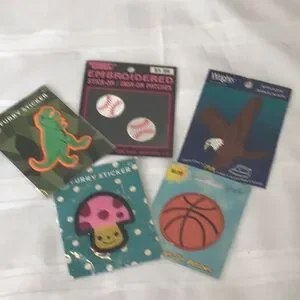 Set of assorted fun stickers featuring a dinosaur, baseballs, eagle, mushroom, and basketball. Perfect for decorating and crafts.