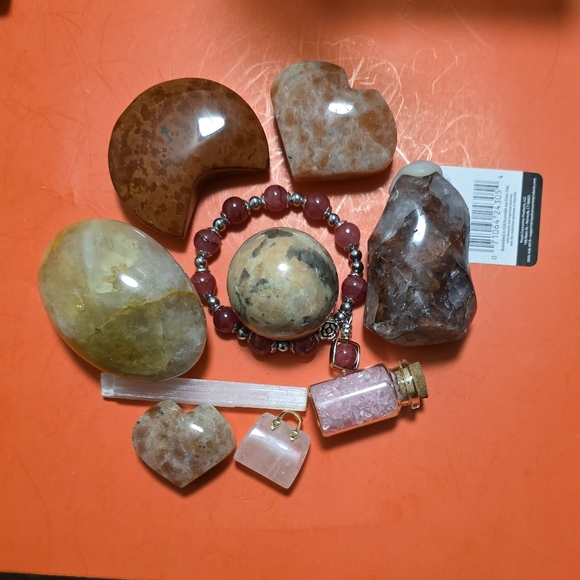 A beautiful assortment of gemstones. Includes heart-shaped and oval stones. Perfect for collectors or decor. Sunstone, red Jasper, golden healer, not sure of the flame.