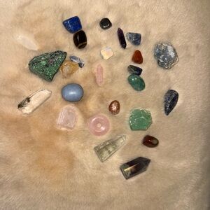 A beautiful collection of assorted gemstones. Includes various colors and shapes. 25 stones- rose quartz, fluorite, celestine, & more.