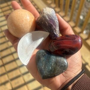 Beautiful collection of assorted gemstones. Includes orange, purple, red, white, and gray stones. Perfect for collectors or decor.