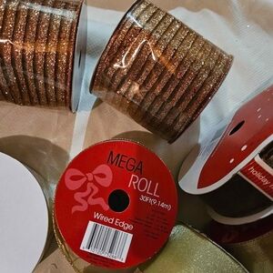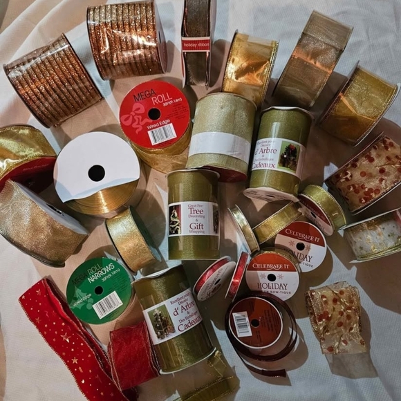 A collection of assorted ribbons in gold and red. Perfect for gift wrapping and crafts.