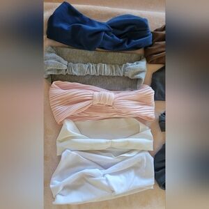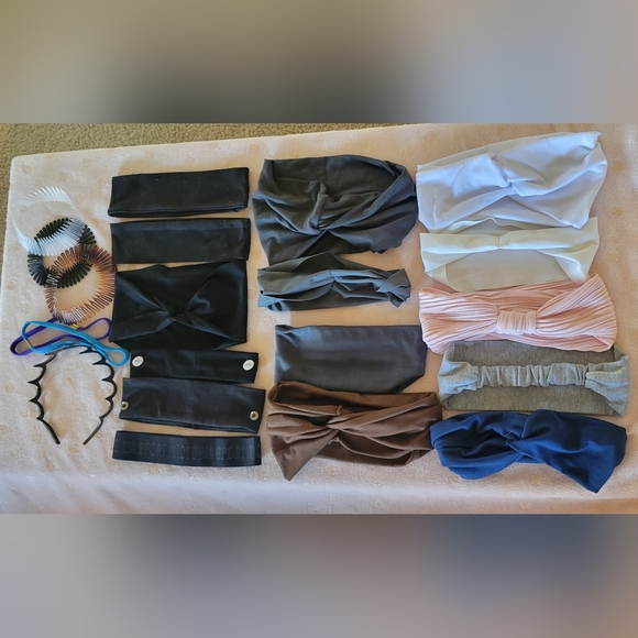 Collection of assorted headbands in various colors. Includes black, brown, gray, pink, and white options. Perfect for versatile styling.