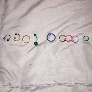 Assortment includes 5 Captives of different colors and sizes, 1 horseshoe ring, 1 belly button ring, 1 infinity hoop, and one twisted ring.