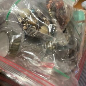 A collection of assorted jewelry including bracelets and earrings. Features a variety of colors such as turquoise, gold, and brown.