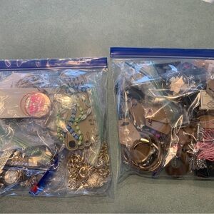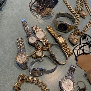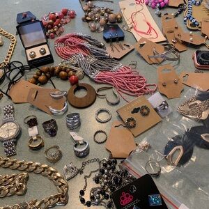 A diverse collection of jewelry including necklaces, bracelets, and earrings. Features gold and silver tones with colorful accents.