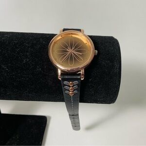 A diverse collection of 17 pieces of jewelry. Included is a black watch, 3 necklaces, 1 choker, 4 bracelets, and 5 rings. The gold color rings are a size 7 and the silver ring is a size 8. Features colors like black, gold, silver, and copper. All are in good condition with minimal wear.