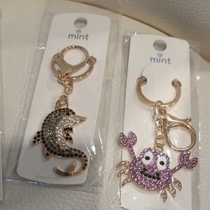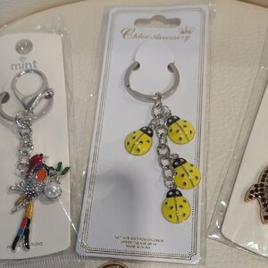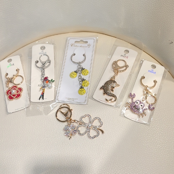 Set of five keychains featuring various charms. Includes floral, animal, and fruit designs. Colors include red, yellow, gold, and silver. All are NWOT