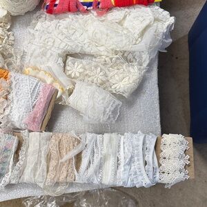 Enhance your crafts with this assorted lace and ribbon set. Featuring a variety of colors including white, blue, and orange, this collection is perfect for any project.
