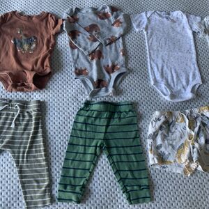 There is 1 Carter's long sleeve body suit, 4 Carter's short sleeve bodysuits, 1 pair of Carter's striped pants, 1 pair of Just One You Carter's striped pants, 1 pair of H&M shorts and 1 pair of longer shorts (unknown brand).