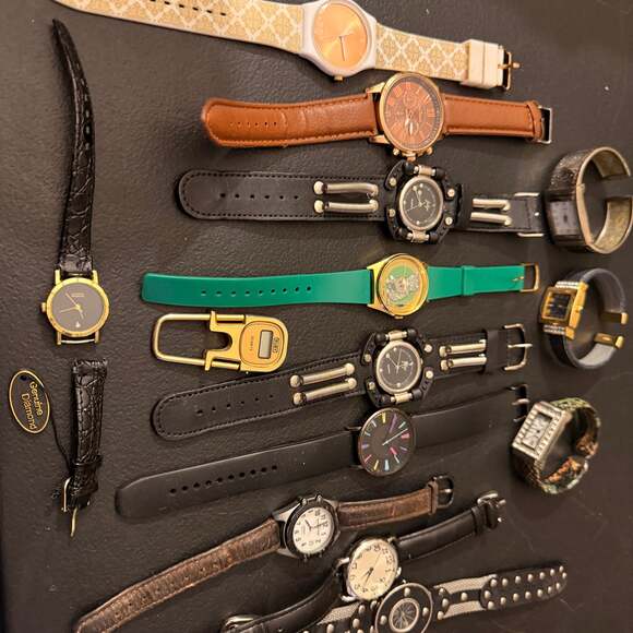 This lot features 15 assorted watches, offering a variety of styles for different tastes. Included are a vintage-inspired gold-tone watch with a 'Genuine Diamond' tag(reattach the strap) several black leather strap watches, a unique green rubber strap watch with a cat design, and a gold-tone digital Ruby watch keychain. Also includes a gold-tone watch with a brown strap, a black band watch with colorful markers, and other unique pieces. Wearable art for your wrist! Styles range from classic to contemporary, perfect for adding a touch of personality to any outfit or for parts/repair projects. Conditions vary across the collection. Batteries needed to work.
