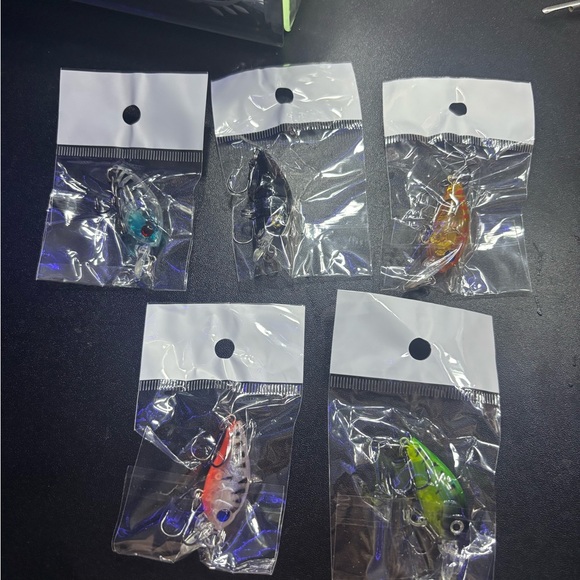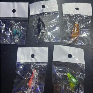 Set of assorted men’s fishing lure keychains in multiple colors. Each piece features durable metal hooks and vibrant finishes. Great as a novelty accessory or gift for fishing enthusiasts. Includes green, blue, orange, red, black color options.