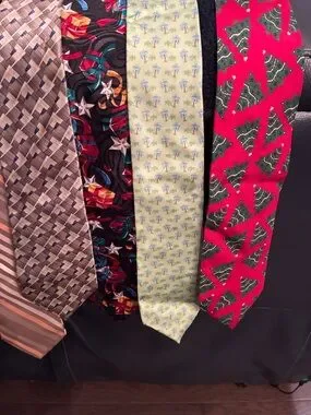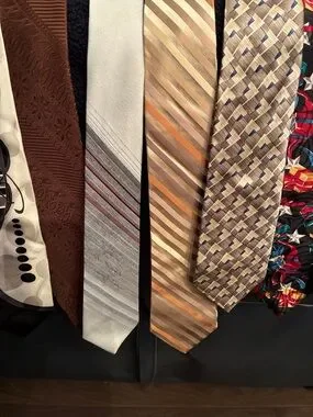 Assorted men's silk and woven neckties in multiple colors. Includes red, yellow, brown, gray, cream, tan, green and black patterns. Versatile selection for business and casual wear. Easy to pair with suits and shirts. Classic and contemporary designs for everyday styling.