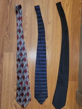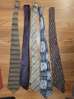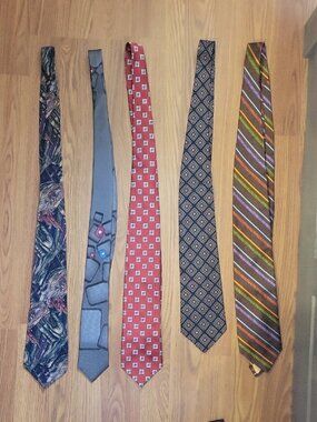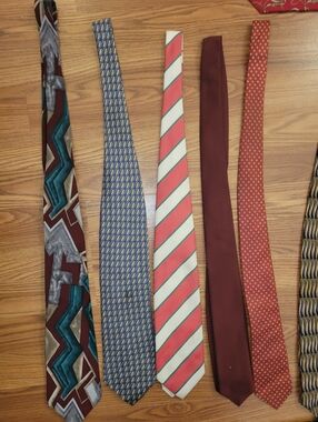Men's neckties. Varied patterns including abstract, geometric, and stripes. Colors feature red, gray, navy, brown, green, purple and gold accents. Classic woven silk appearance. Great for mixing with suits and blazers and perfect for anyone with an office job.