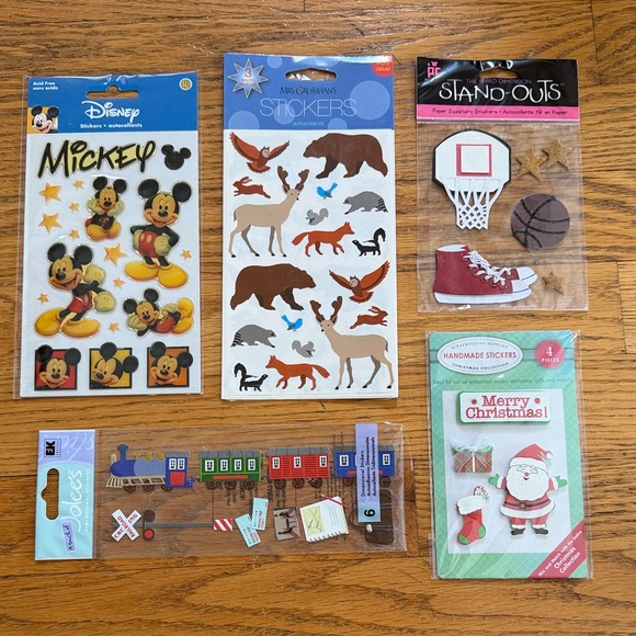 A fun collection of assorted stickers featuring Disney characters, Christmas themes, and more. Perfect for crafts and decoration.
