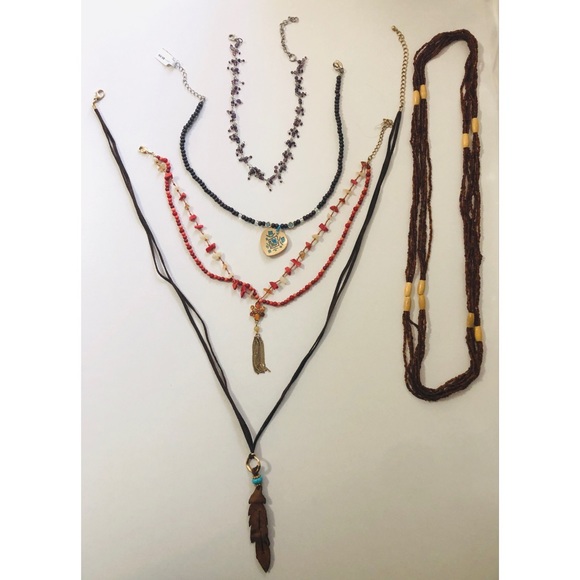 Five assorted necklaces ranging from a pretty beaded choker to several longer lengths. A great deal!