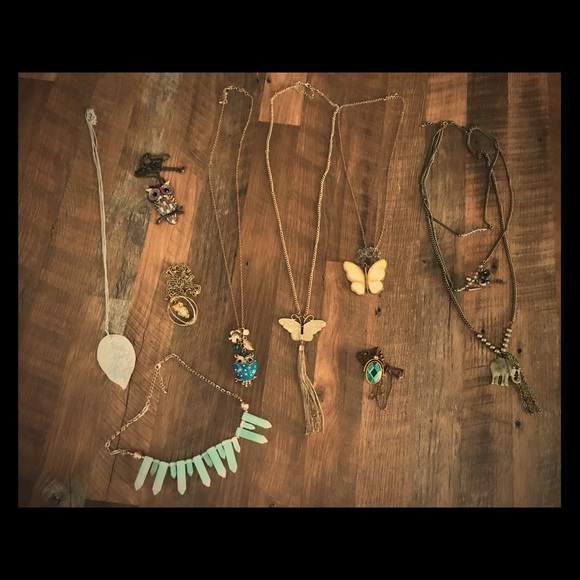 Total there are 9 necklaces included here. The majority of them are long chained necklaces except for 1.