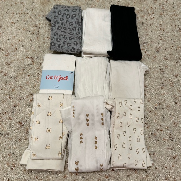 Collection of neutral and patterned tights. Includes black, white, gray, and cream colors with bow and heart patterns.