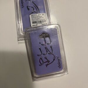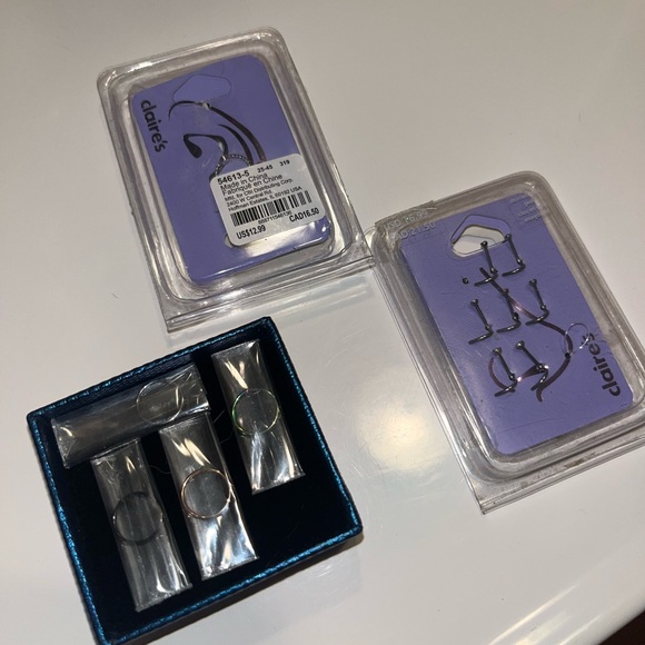 12 new nose rings still in packaging. 3 different kinds. 7 are Claire’s 20G silver studs with the curved “L” stem. One is a random silver hoop with a diamond on it. 4 are assorted color 20G hoops with the latch opening.