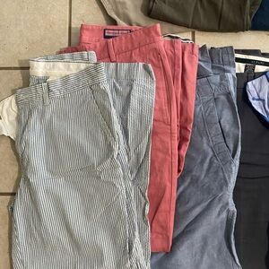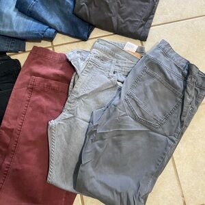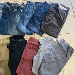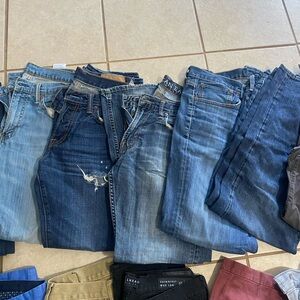I have a bundle for 19 pairs of pants ALL PANTS ARE size 32. There are about 3-4 that are a skinny Jean fit, 4-5 dress pants and the rest are regular. Length is between 30-32 as well I believe most are in the 30” length range. A lot of brands with a lot of life in them and no stains! I have 3 American Eagle, 2 Ralph Lauren, lucky brand, Abercrombie and more that it won’t let me list that I can message. I can have most of the pants listed individually if you would like to purchase that way.