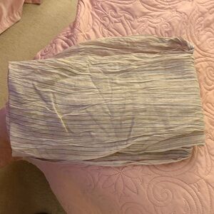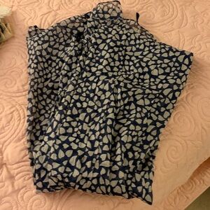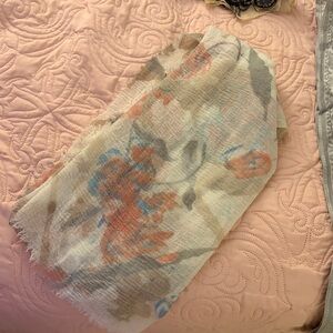 Set of five patterned scarves. Includes floral, geometric, and abstract designs. Features colors like black, blue, and cream. Light wear. Sold as is.