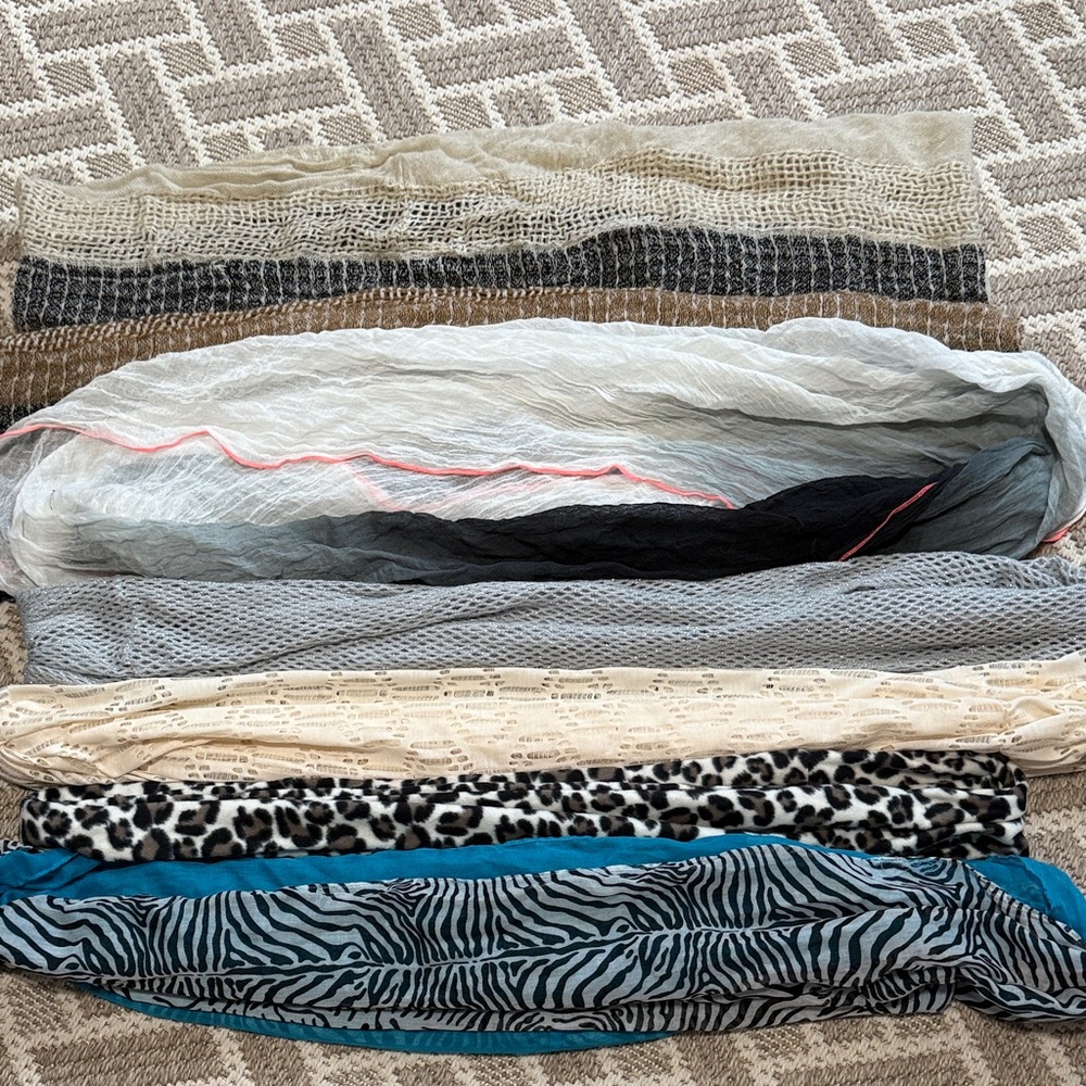 Collection of assorted patterned scarves. Includes animal prints and solid colors.