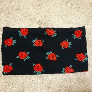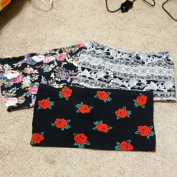 Three tube tops for a deal of $20. Two are floral patterns and the other is an indie print. Each are made of cotton and spandex. The pink floral and indie tube tops have a scrunched up center and a built in adhesive part on inner rim for breast support. The red rose one does not have. They are comfortable and can stretch pretty well and may be a little fade in print but they have only been worn once. Originally bought for $33 altogether. Perfect for the Summer or Spring.