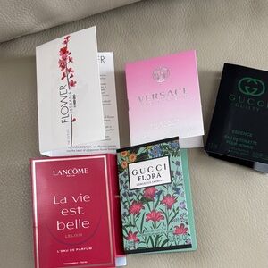 Collection of assorted perfume samples. Includes brands like Gucci, Valentino, and Lancome. Features a variety of floral and musky scents. Perfect for trying new fragrances.