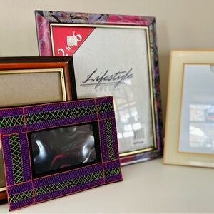 Some vintage, some newer. Various sizes. 80s purple floral, gold and ivory art deco, silver gray speckled w/ gold trim, baby blue plastic collage, vintage classic wood, embroidered frame.