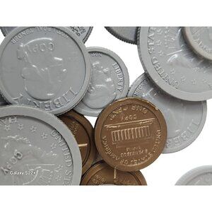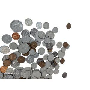 Variety of plastic play money coins modeled after real currency. Ideal for educational purposes, board games, or pretend play.