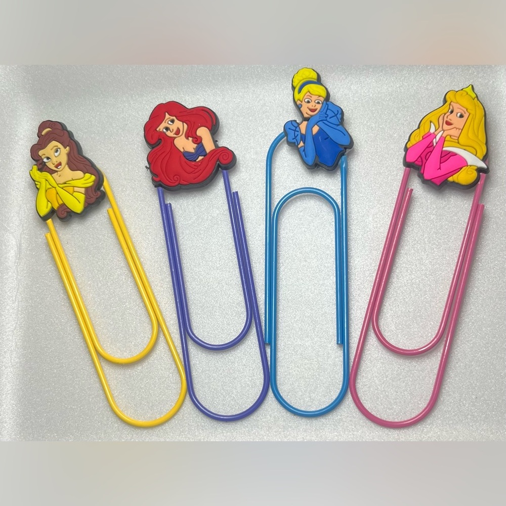 Set of colorful paperclip bookmarks featuring princess designs such as Belle from Beauty and the Beast, Ariel from The Little Mermaid, Cinderella, and Aurora from The Sleeping Beauty.