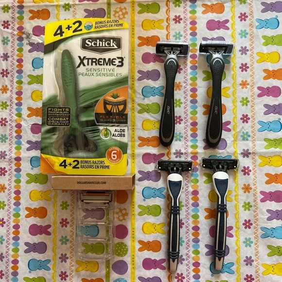 What is included (all unused): Schick Xtreme 3, 6 razors 2 Bic 4 blade 2 Unknown brand, 3 blade. 1 cartridge refill for Dollar Shave Club