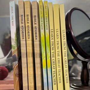 Enhance your home with this set of religious books. Featuring a variety of titles, these books come in a mix of colors including yellow, cream, and brown. Perfect for adding a thoughtful touch to your decor.