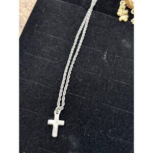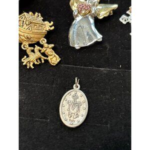 Cross pendant has minor surface wear. Angel pin shows light tarnish. Measurements vary; chain lengths approximately 18 inches.