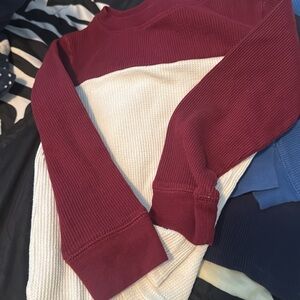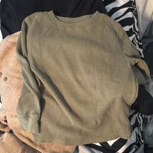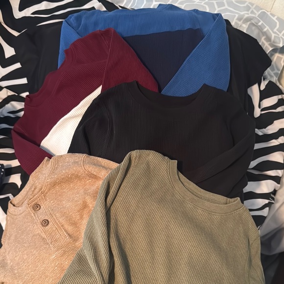 Collection of ribbed long sleeve tops in various colors. Includes black, blue, burgundy, tan, and olive green. Cat and Jake Size 4T