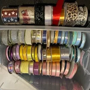 Organize your craft supplies with this assorted ribbon storage box. Featuring a variety of colors including red, gold, silver, and purple, this collection is perfect for any project. Keep your ribbons neatly stored and easily accessible.